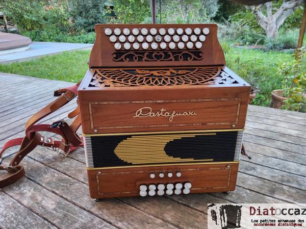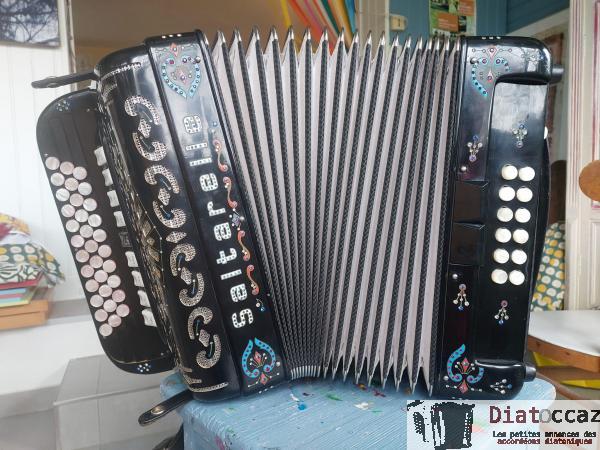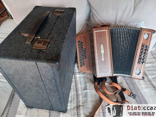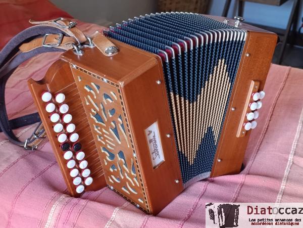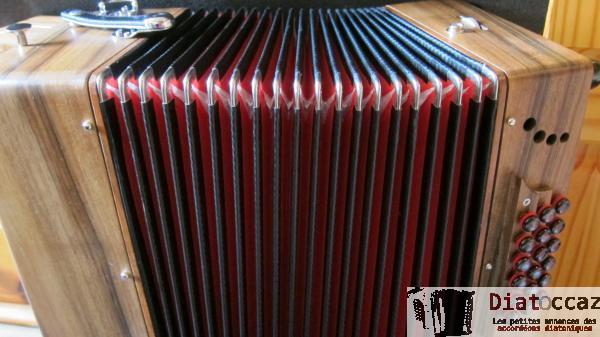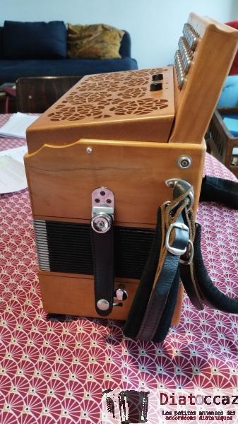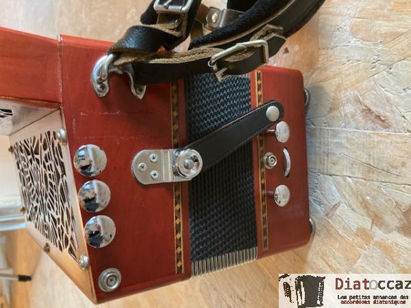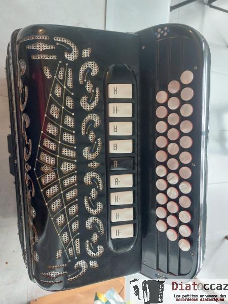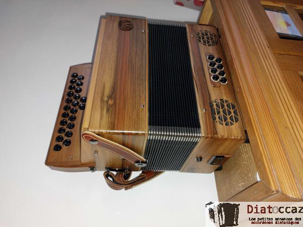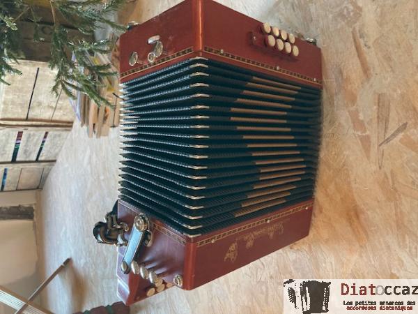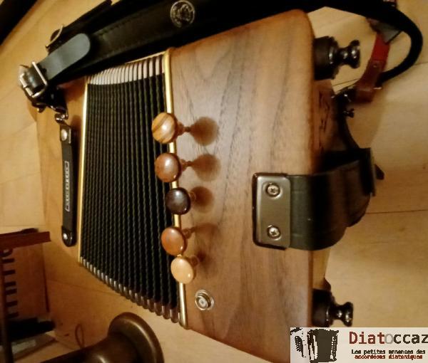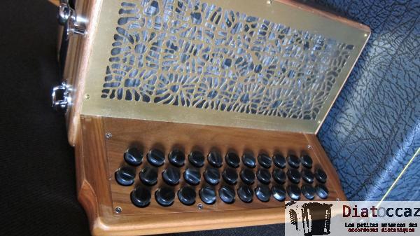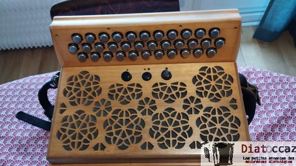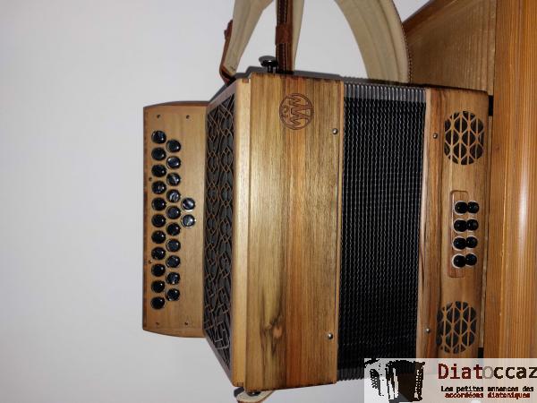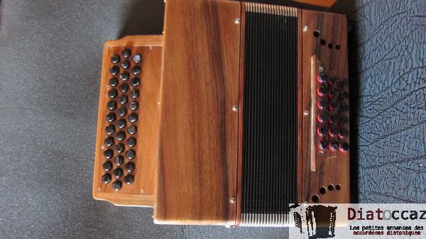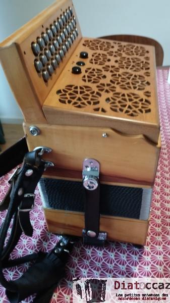 Main droite : 3 rangs (33 boutons), 3 voix, 5 registres (situés derrière le clavier, à double effet).